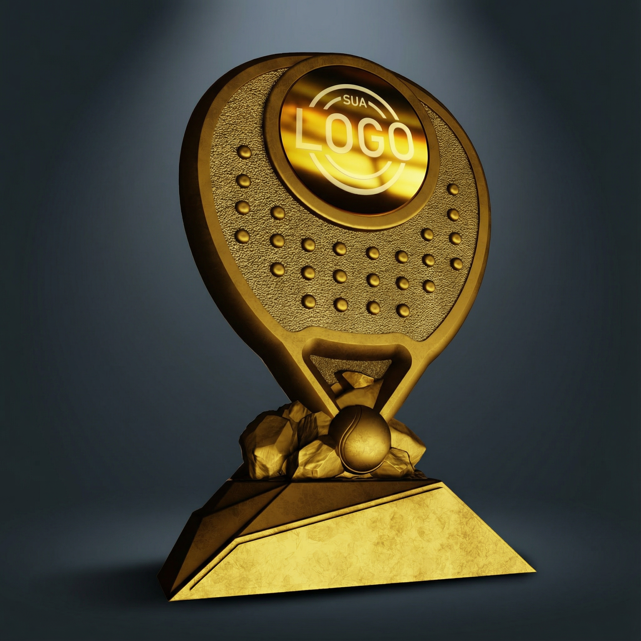 Trofeo con elemento central destacado y marcos laterales que crean profundidad. Equilibra heroísmo (conquista) y espacio para branding, lo que genera