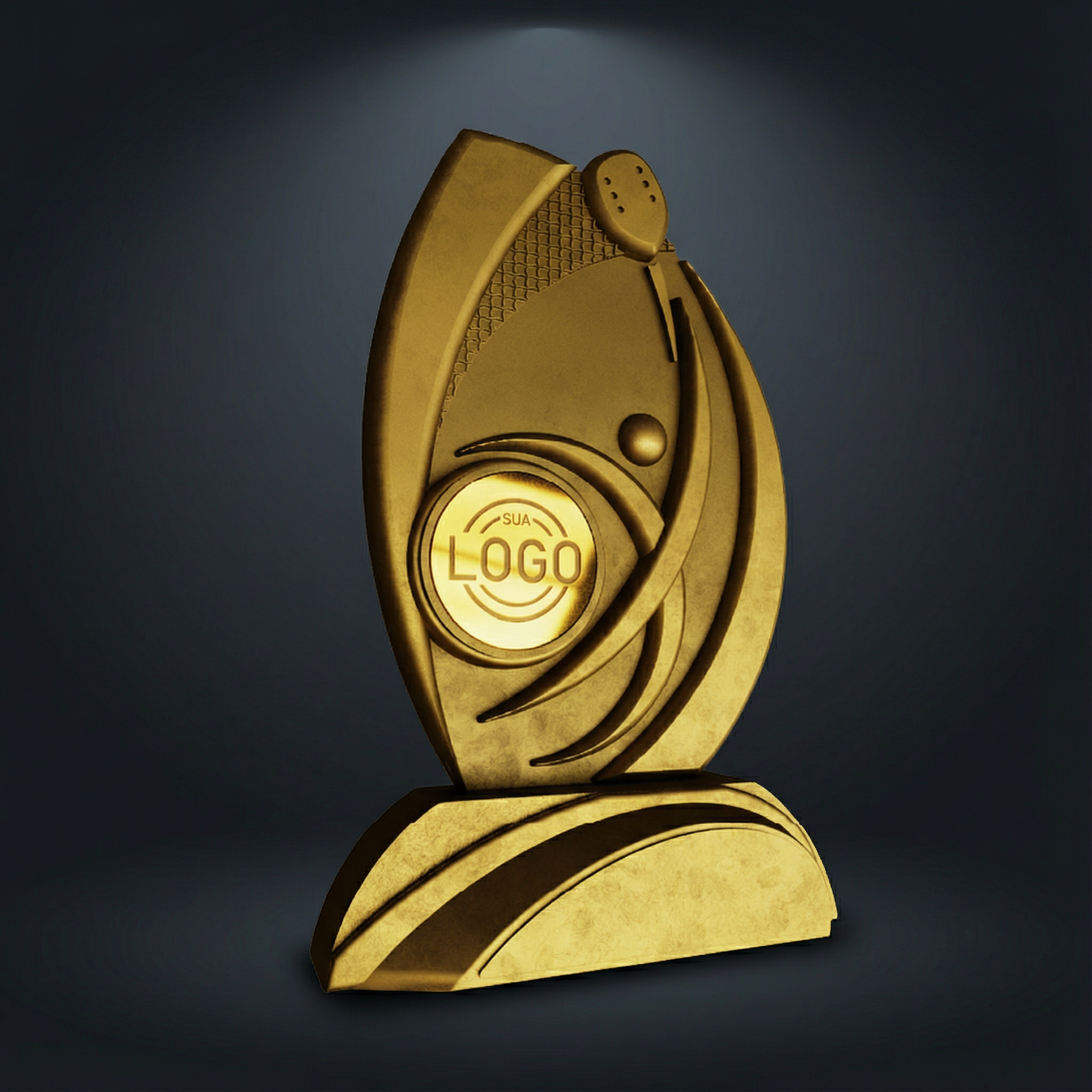 Pieza pensada para gran volumen de podios en el mismo evento. Frente claro para logo/tema y base para plaqueta 1º–4º.
