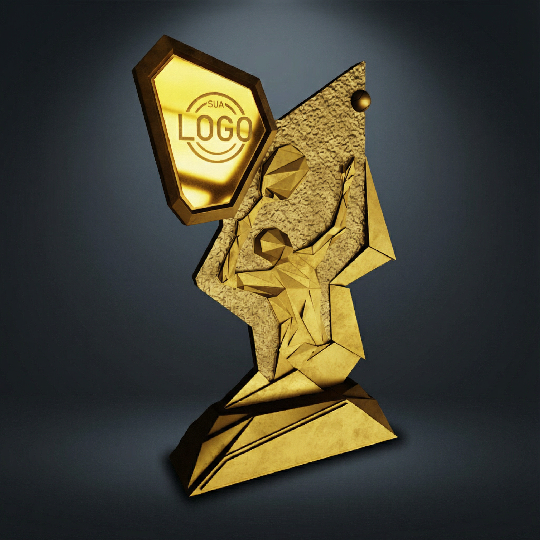 Peça com linhas firmes e área central ampla para a identidade do torneio. Mantém ótima leitura em fotos e materiais de divulgação. Base estável preparada para plaqueta, funciona bem em eventos com muitas categorias.