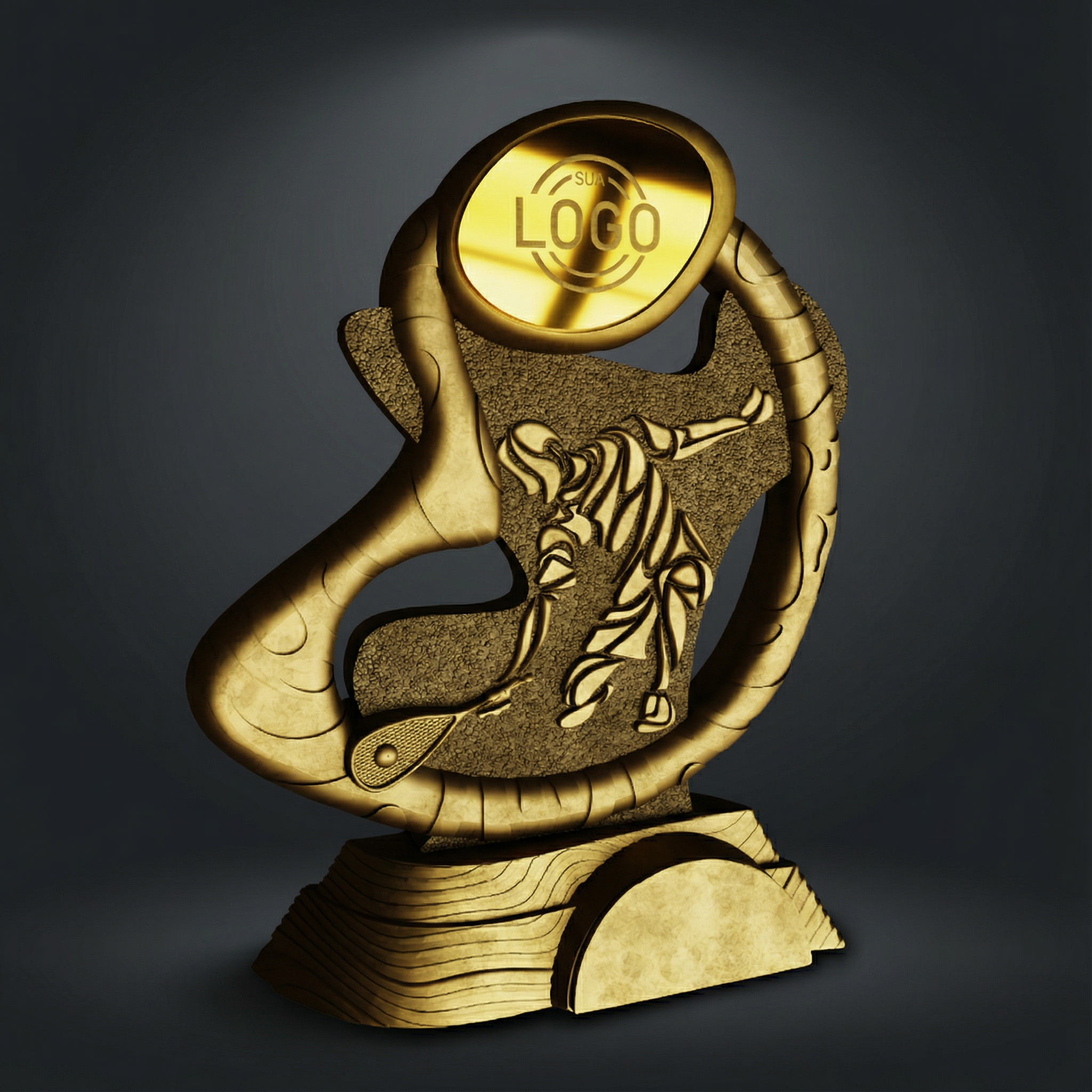 Peça de presença firme, com ângulos marcados que valorizam luz e sombra. A face frontal favorece a identidade do torneio (logo/tema), enquanto a base comporta plaqueta de posição. Ideal para pódios que buscam estética contemporânea, sem perder a clareza de leitura em fotos e vitrines.