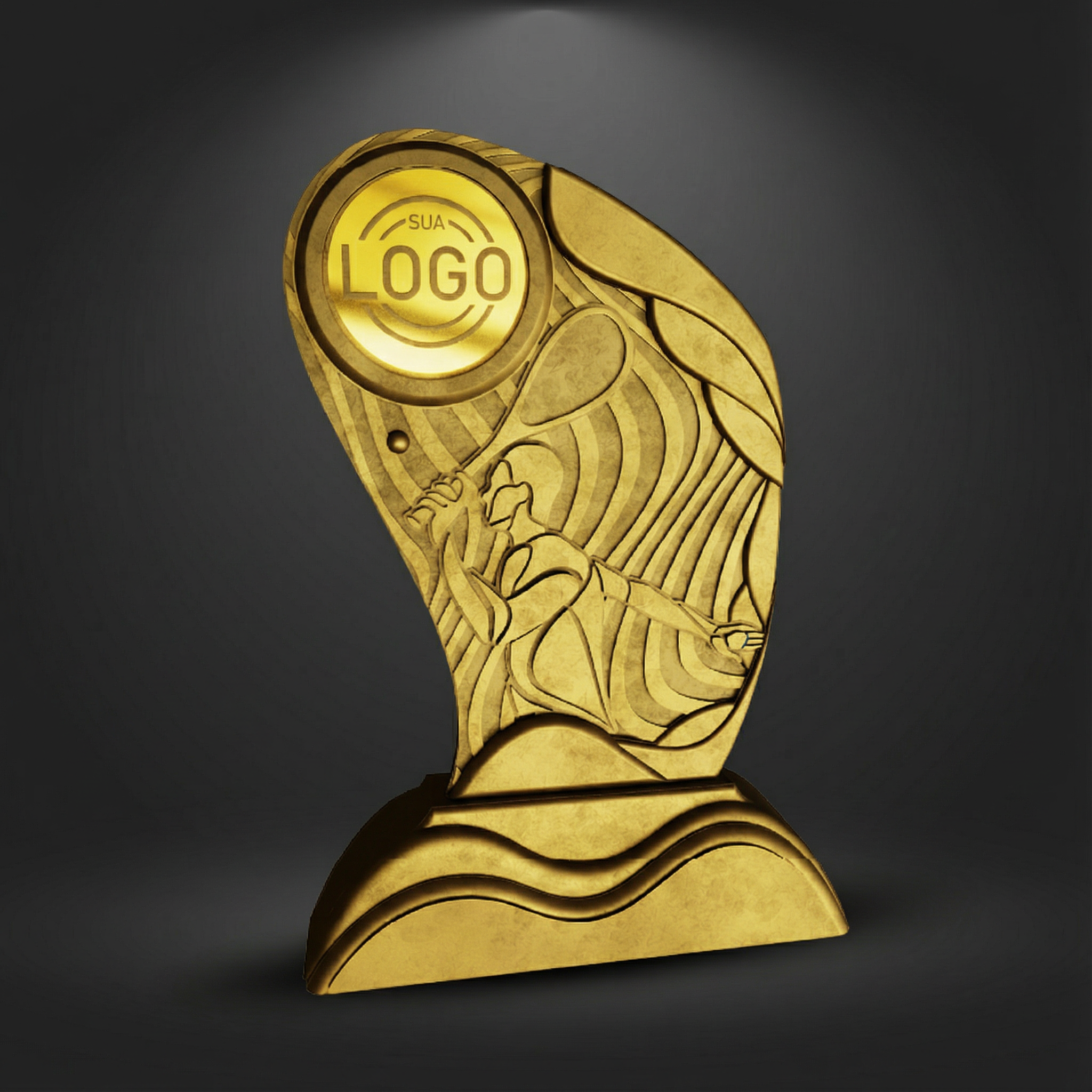 Curvas orgânicas e leitura suave, criando contraste elegante com a rigidez da base. O desenho fluido destaca o caráter artístico da premiação, sem per
