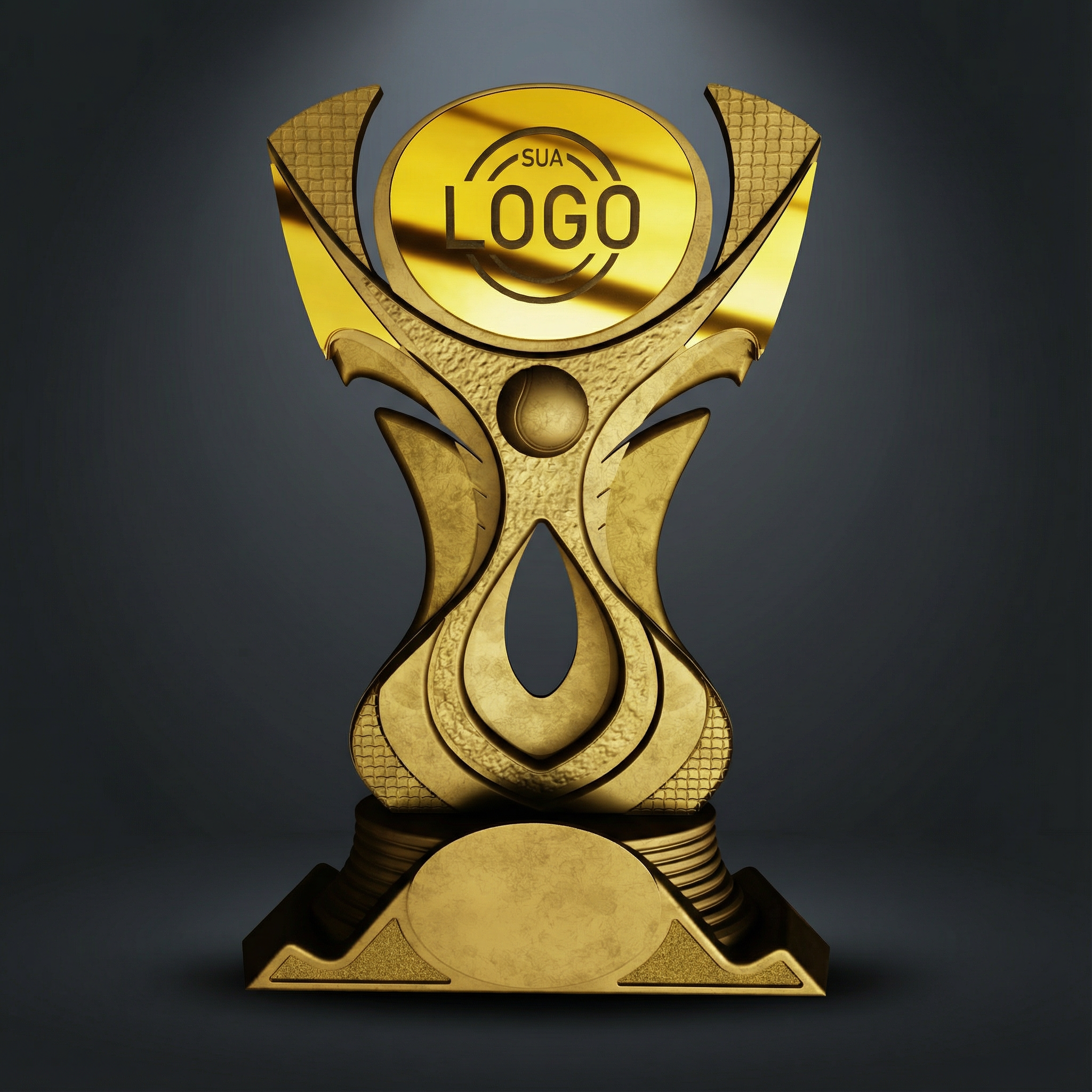 Peça em formato de atleta, braços elevados sustentando um medalhão circular para a identidade do evento. O recorte central em “gota” e as texturas em relevo criam profundidade e leitura premium no pódio.