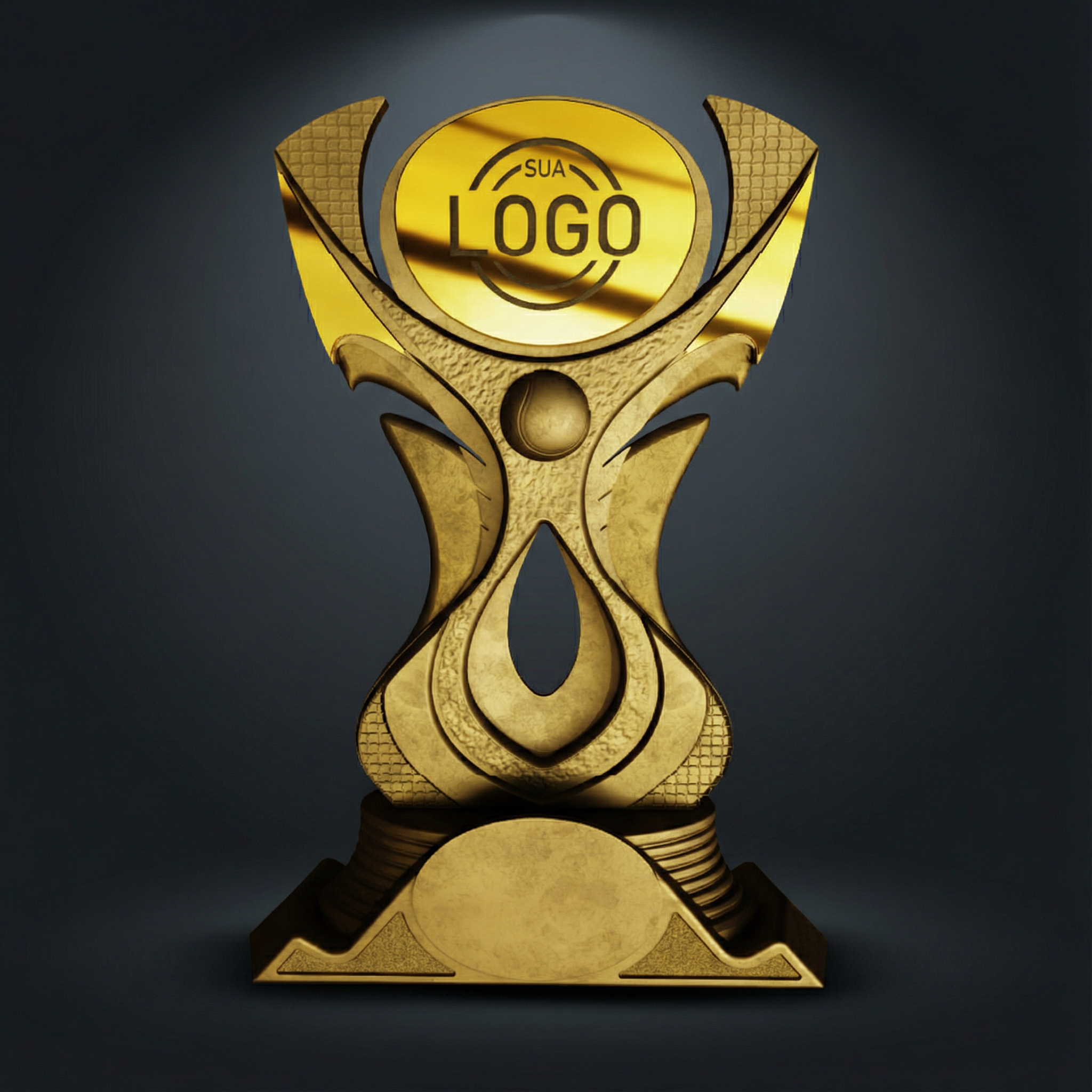 Peça de 21 cm com desenho escultórico e área circular destacada para o logo do evento. O recorte central garante leitura premium no pódio. Base estáve
