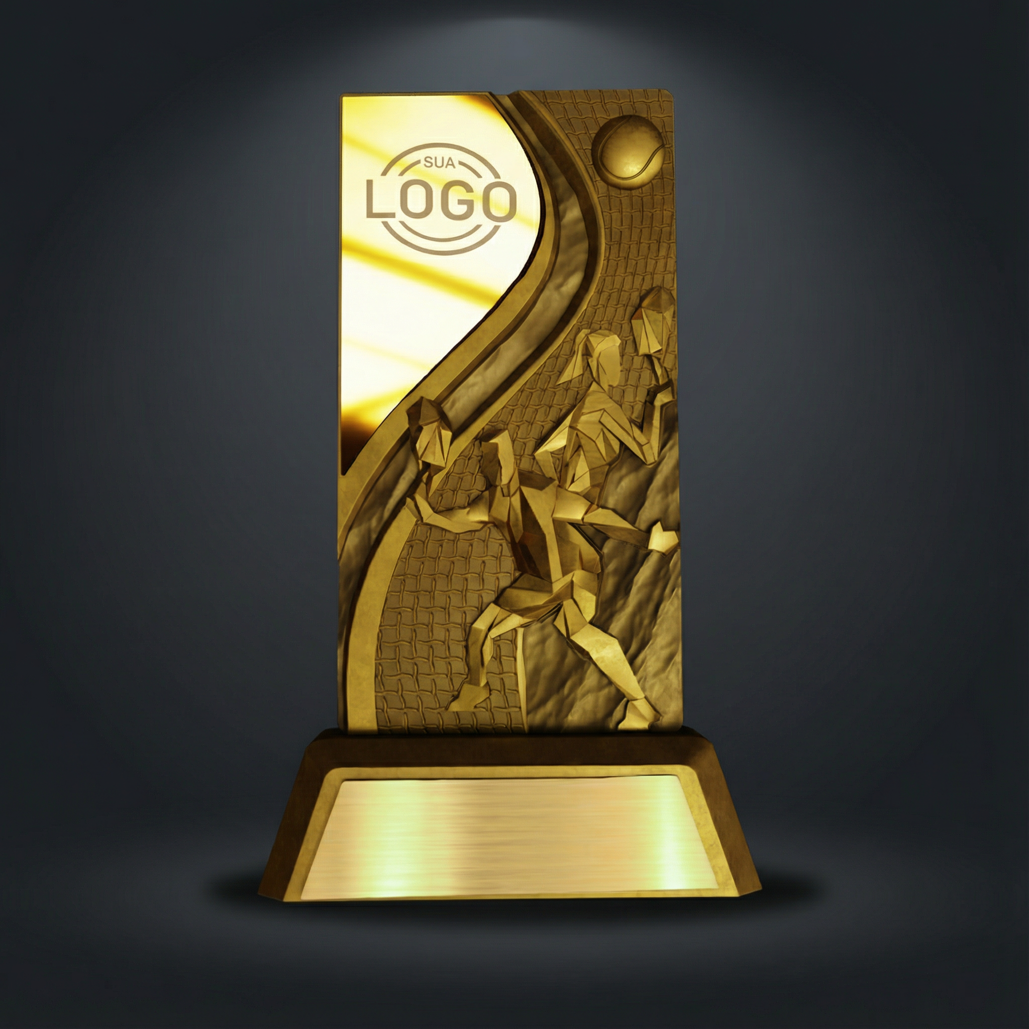 Formato retangular vertical, com frente organizada para nome do evento e selos de patrocínio; base com plaqueta de posição.